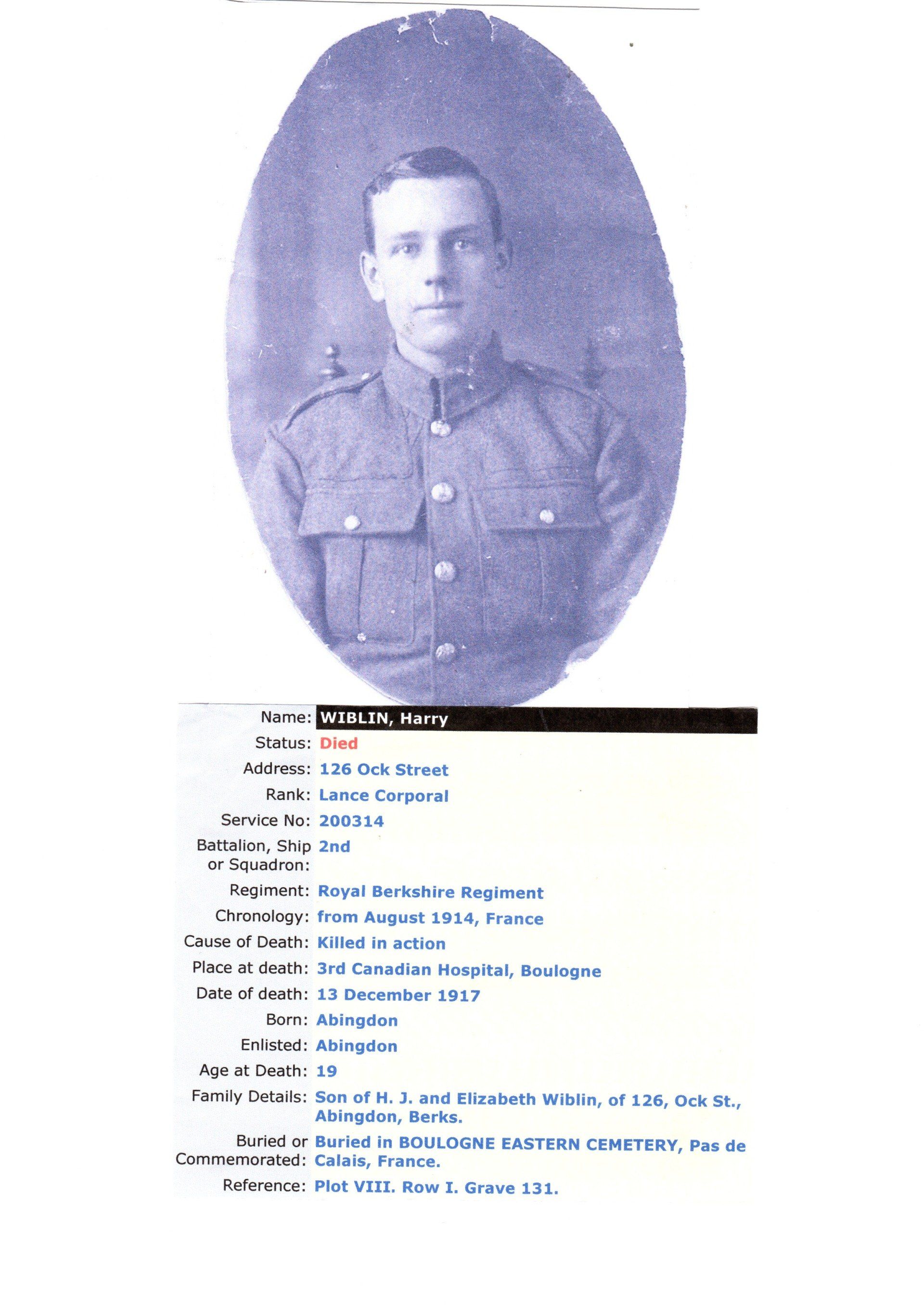 Family Details: Son of H. J. and Elizabeth Wiblin, of 126, Oak St., Abingdon, Berks.