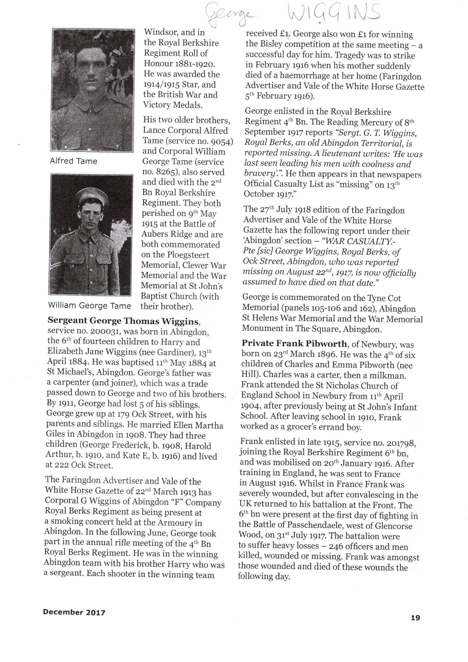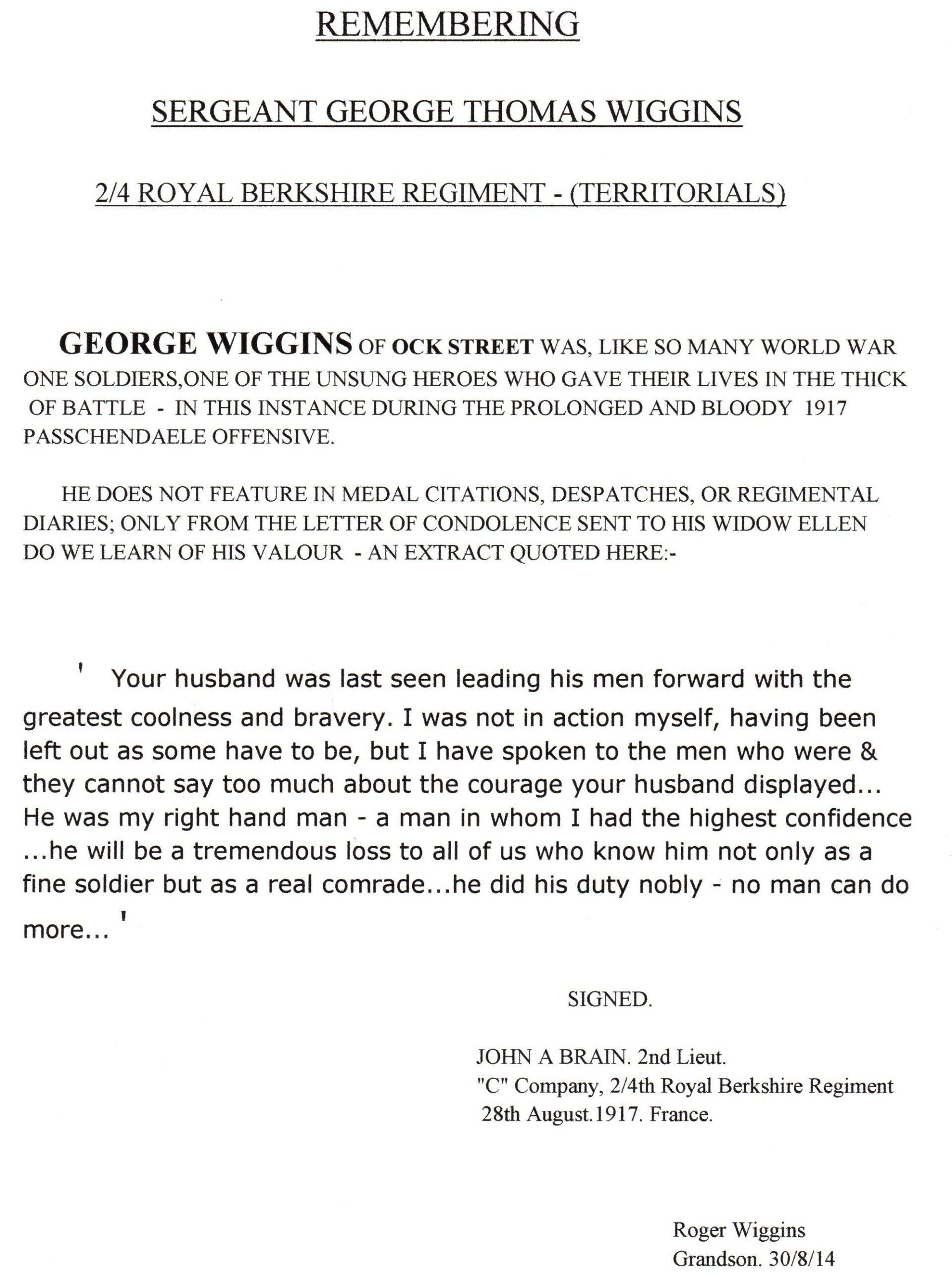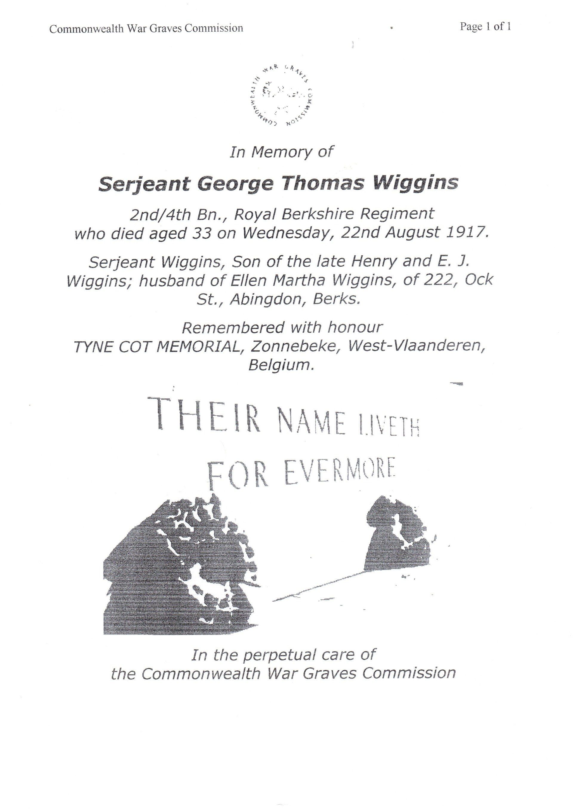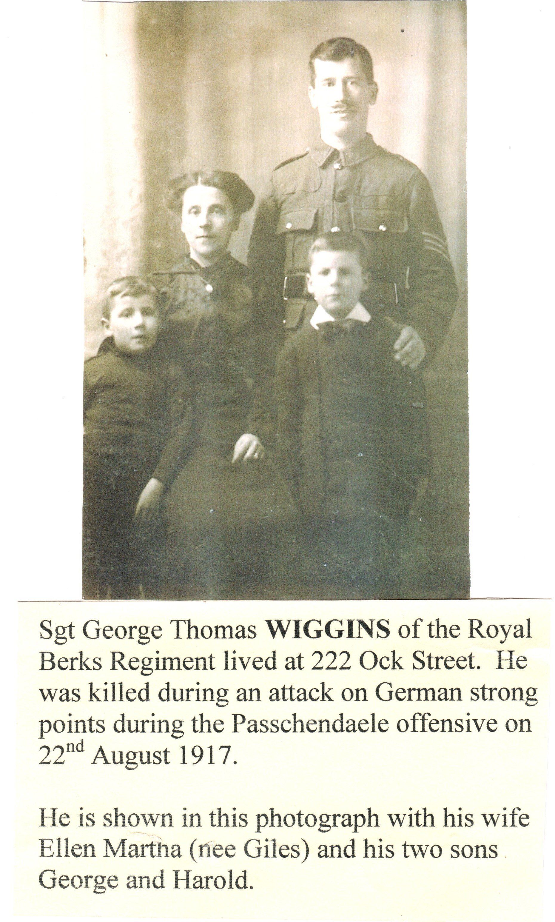 Family Details: Son of the late Henry and E. J. Wiggins; husband of Ellen Martha Wiggins, of 222, Ock St., Abingdon, Berks.